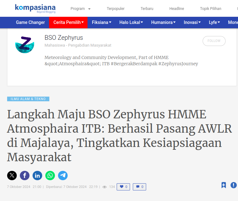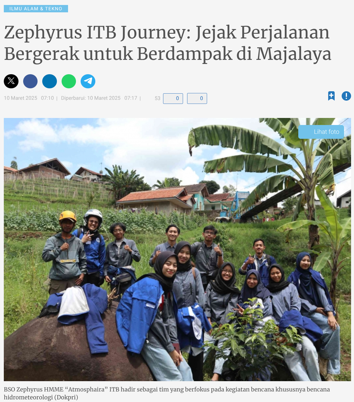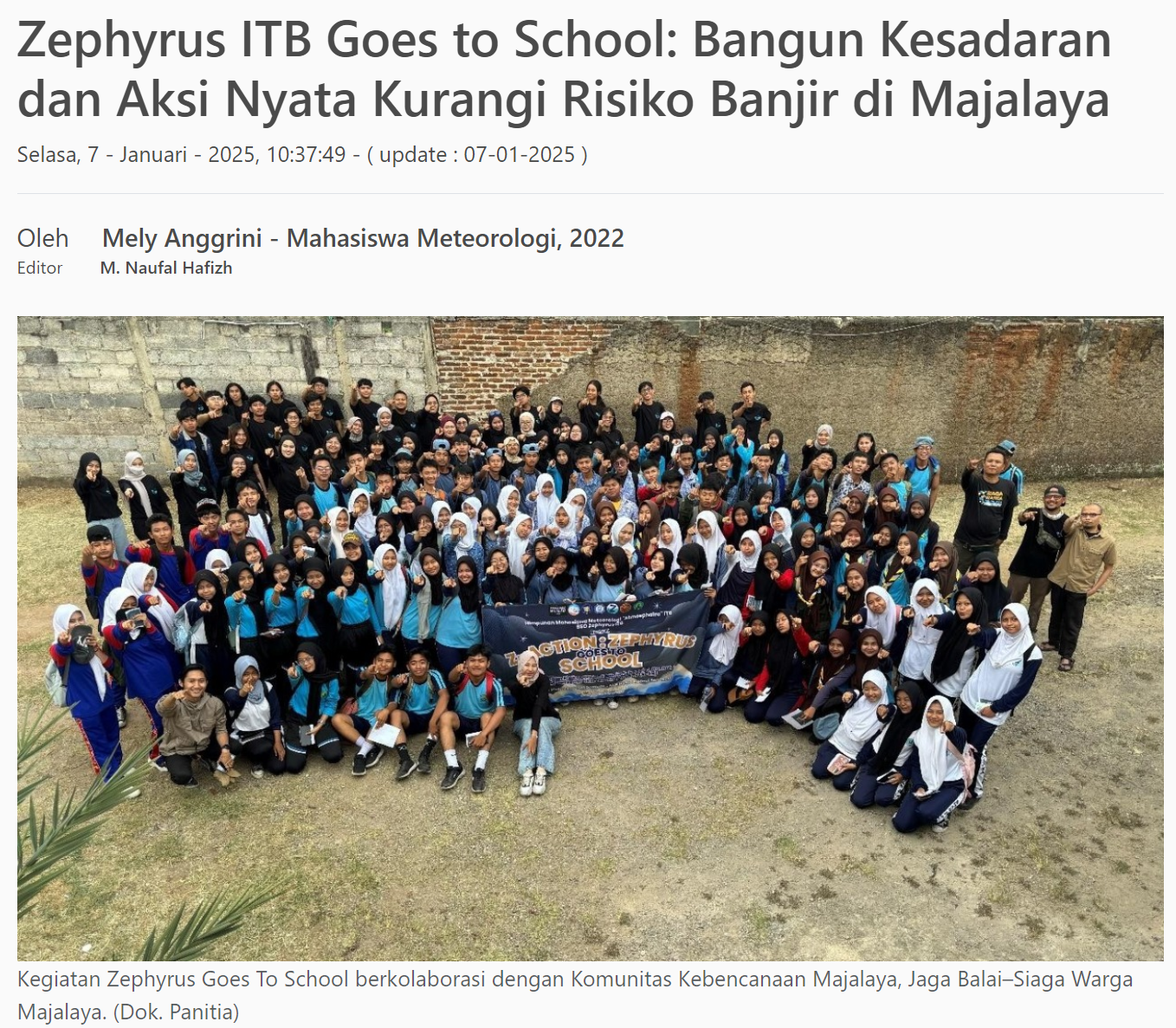 BSO Zephyrus HMME “Atmosphaira” ITB – atau yang kerap disebut Zephyrus, sebuah tim yang hadir dengan misi utama mengaplikasikan keilmuan meteorologi dalam bentuk kegiatan pengabdian masyarakat. Tim ini berfokus pada mitigasi bencana hidrometeorologi, khususnya bencana banjir, yang menjalankan serangkaian program berbasis teknologi dan edukasi dengan tujuan meningkatkan kesadaran serta kesiapsiagaan masyarakat terhadap risiko bencana. Tahun demi tahun telah dilewati dalam melangsungkan tujuannya, hingga sampailah pada tahun 2024 ini, Zephyrus kembali melanjutkan perjalanan di sebuah wilayah yang dipilih sebagai lokasi pengabdian masyarakat, yakni Majalaya, Kabupaten Bandung, Jawa Barat.